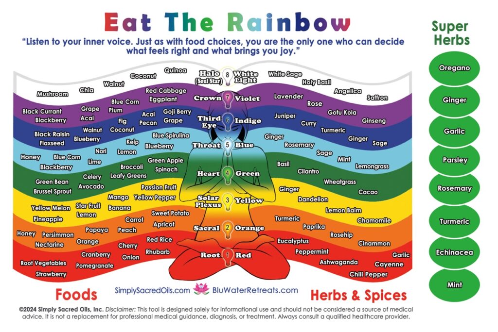 Mindful eating is about making intentional choices that support a healthy and vibrant lifestyle. Embrace the colors of the rainbow on your plate! Eating foods that align with the Chakra system not only nourishes your body but also balances your energy and promotes overall well-being.