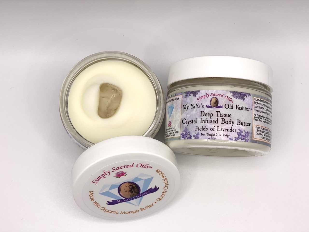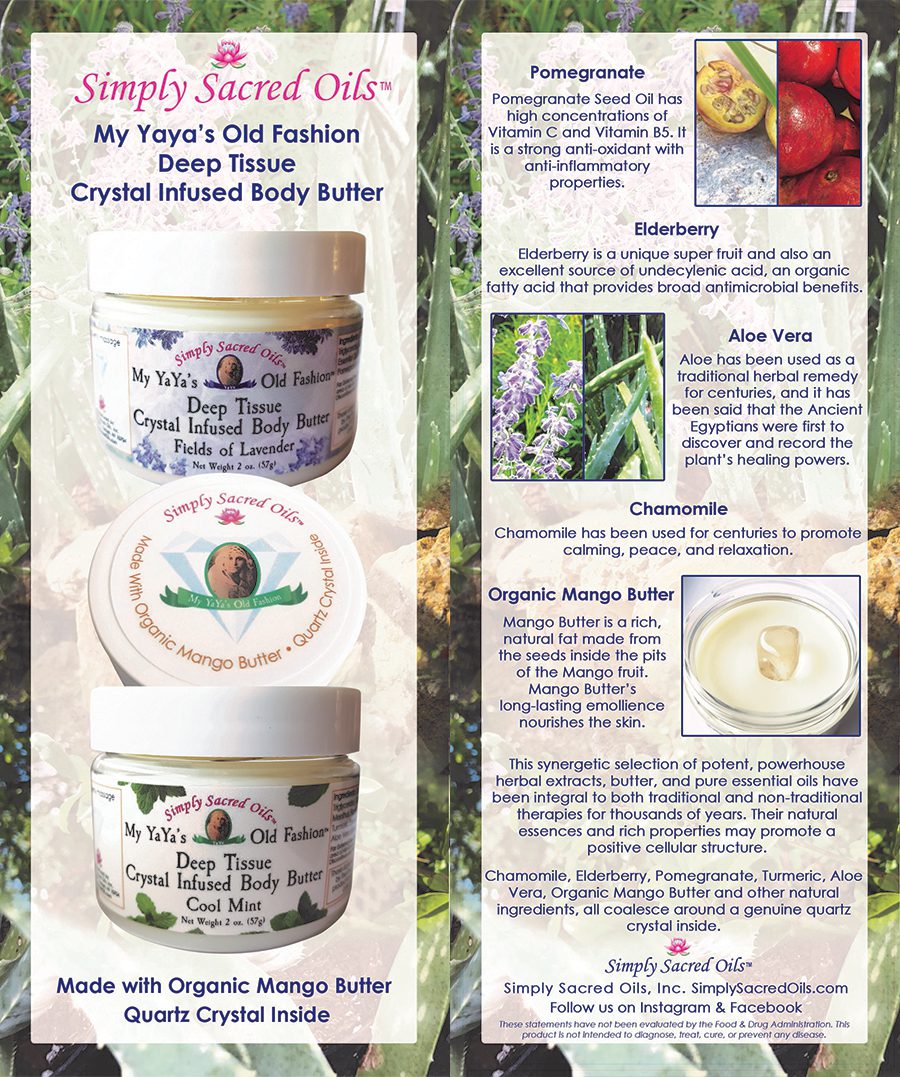 This synergetic selection of potent, powerhouse herbal extracts, butter, and pure essential oils has been integral to both traditional and non-traditional therapies for thousands of years. Their natural essences and rich properties may promote a positive cellular structure. Chamomile, Elderberry, Pomegranate, Aloe Vera, Organic Mango Butter, Lavender, Frankincense, Cedarwood & Turmeric Essential Oils, along with other natural ingredients, all coalesce around a genuine quartz crystal inside.