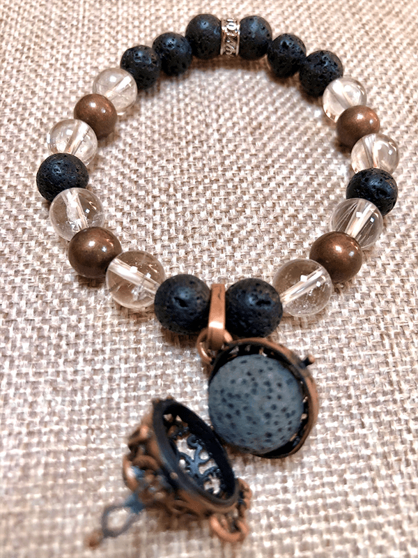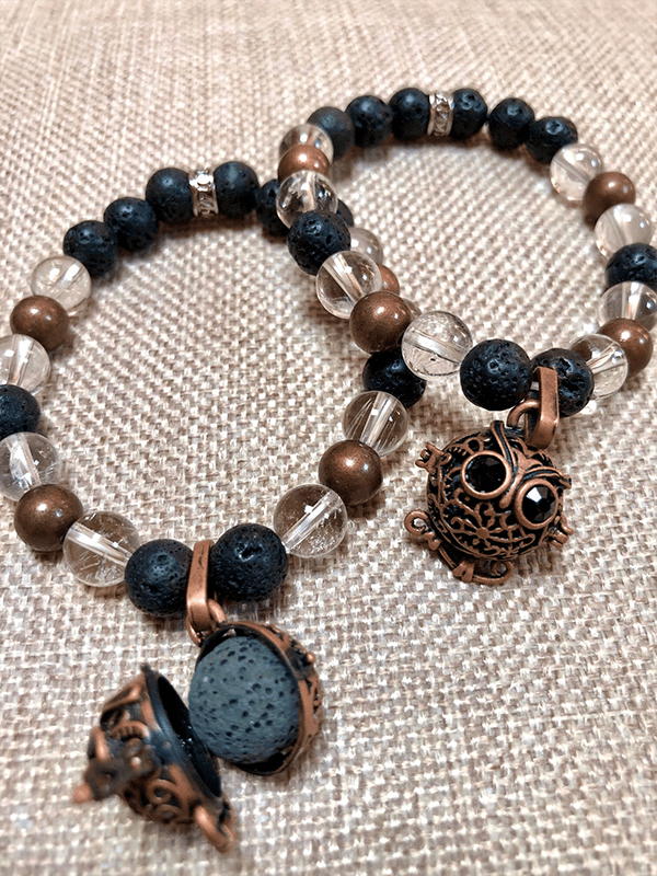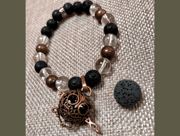A Copper, Clear Quartz, and Lava Stone bracelet. This bracelet has an owl globe locket that houses a large lava bead to absorb your choice of aromatherapy. Stretch to fit.