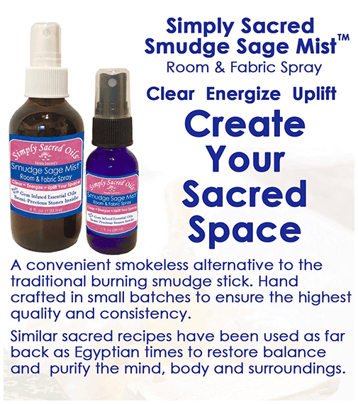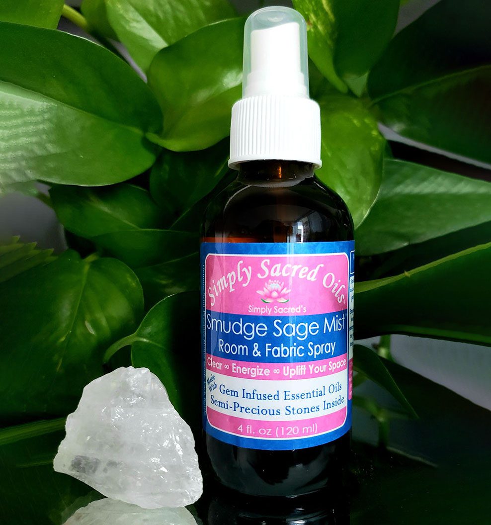 Simply Sacred’s Smudge Sage Mist™ Room & Fabric Spray; Use this spray the same way you would when you are smudging with the plant. As you spray, focus your intention on releasing stagnant energies so they can be recycled back into the earth. Spray high into the air above and around the area or environment you choose to clear, creating your sacred space.