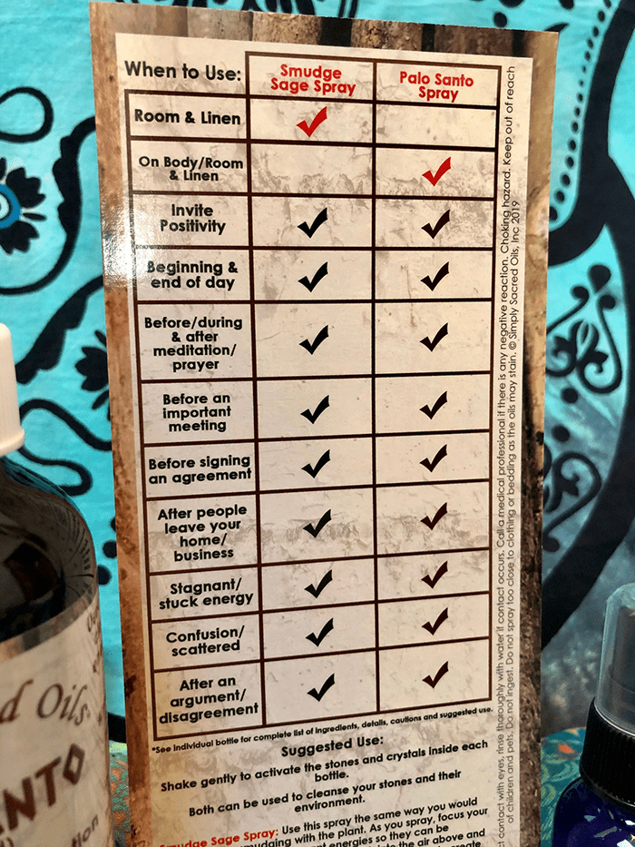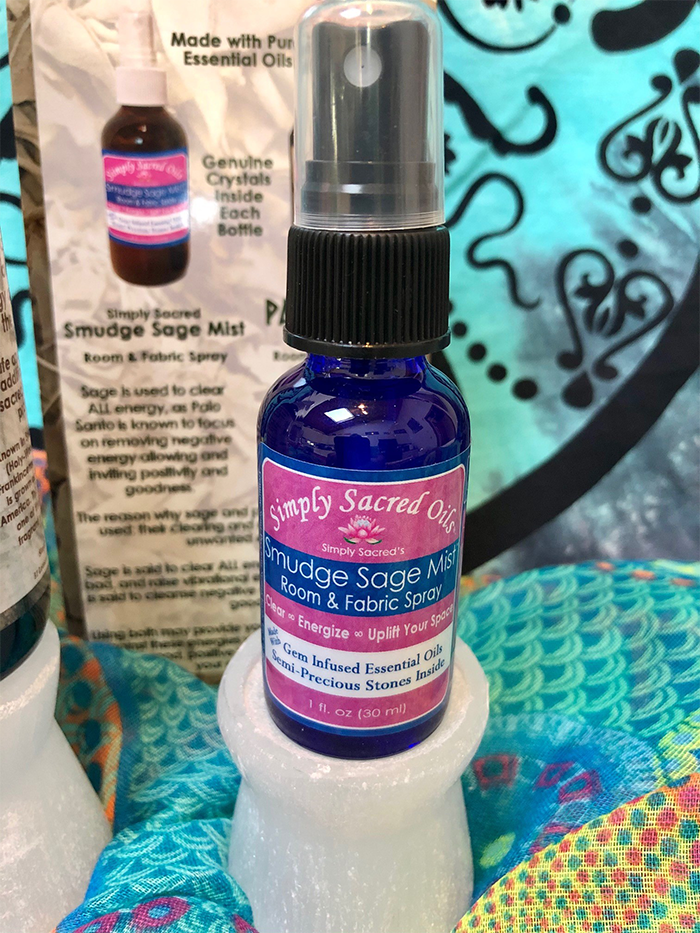 Simply Sacred’s Smudge Sage Mist™ Room & Fabric Spray; Use this spray the same way you would when you are smudging with the plant. As you spray, focus your intention on releasing stagnant energies so they can be recycled back into the earth. Spray high into the air above and around the area or environment you choose to clear to create your sacred space.