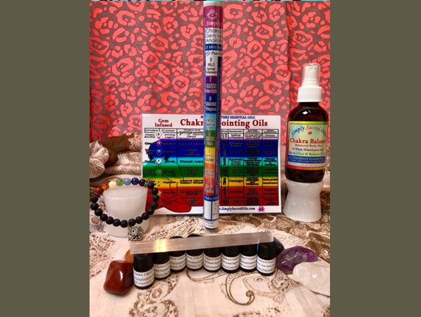 Simply Sacred Oils™ chakra balancing, gem-infused anointing oils sampler kit of 8 mini glass bottles with an orifice reducer.