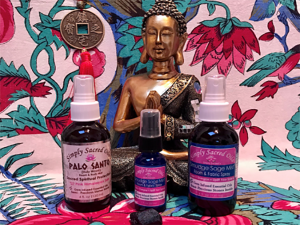 Simply Sacred’s Smudge Sage Mist™ Room & Fabric Spray; Use this spray the same way you would when you are smudging with the plant. As you spray, focus your intention on releasing stagnant energies so they can be recycled back into the earth. Spray high into the air above and around the area or environment you choose to clear, creating your sacred space.